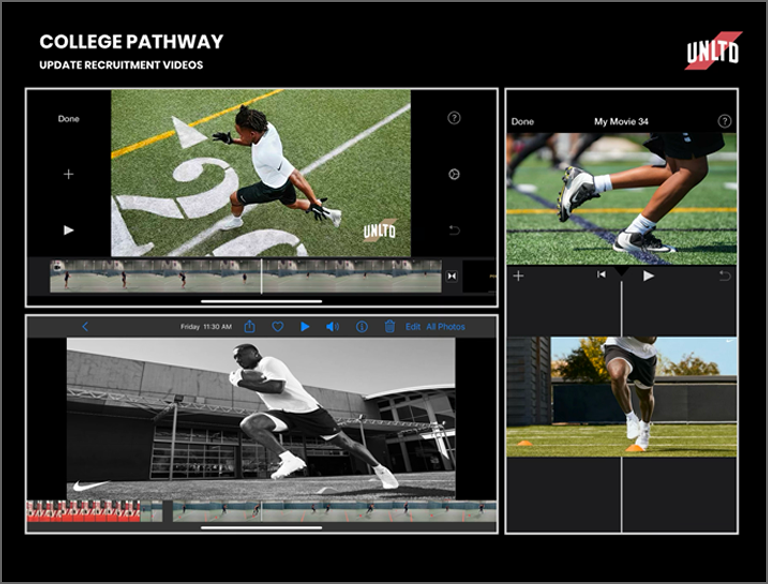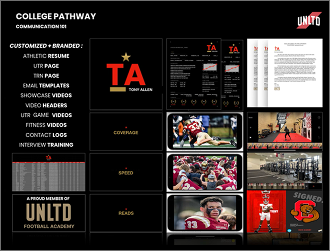 Successfully graduating from UNLTD can take many different forms. Some of our players choose to continue their football career on the collegiate level. For these players, the Academy has created the UNLTD College Pathway Program. This program works with parents and players to help determine the correct academic fit, social fit, financial fit, and athletic fit for the player. A target list of schools and coaches are developed. A suite of recruitment materials are created for outreach to schools including athletic resumes, technical videos, highlight videos and more. Players are prepped for playing showcases, coach interviews and on-site visits. In this program, ULNTD helps to manage and coordinate the athletic and academic outreach and overall recruitment of the player.
